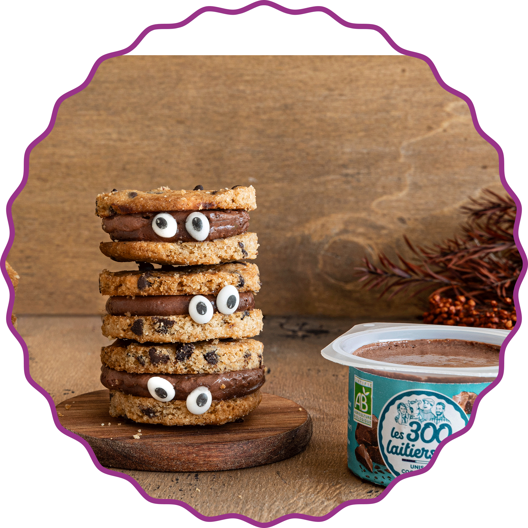 Prendre un cookie, garnir un côté puis venir coller un 2ème cookie pour former un sandwich.