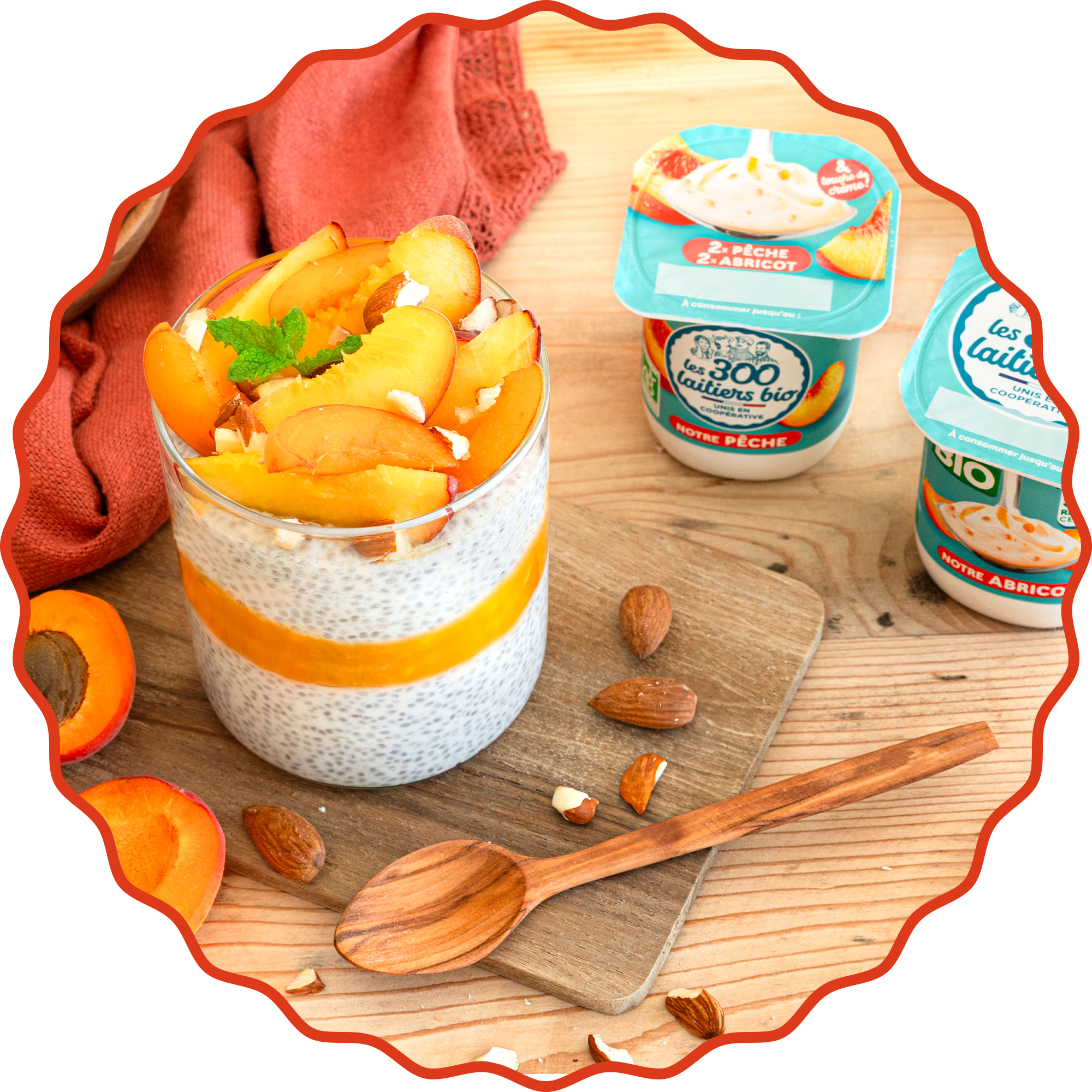 Dans un saladier, mélangez le yaourt Les 300 Laitiers bio à la pêche ou à l’abricot , le lait et les graines de chia. Laissez reposer au réfrigérateur pendant 20 à 30 minutes pour que les graines gonflent.