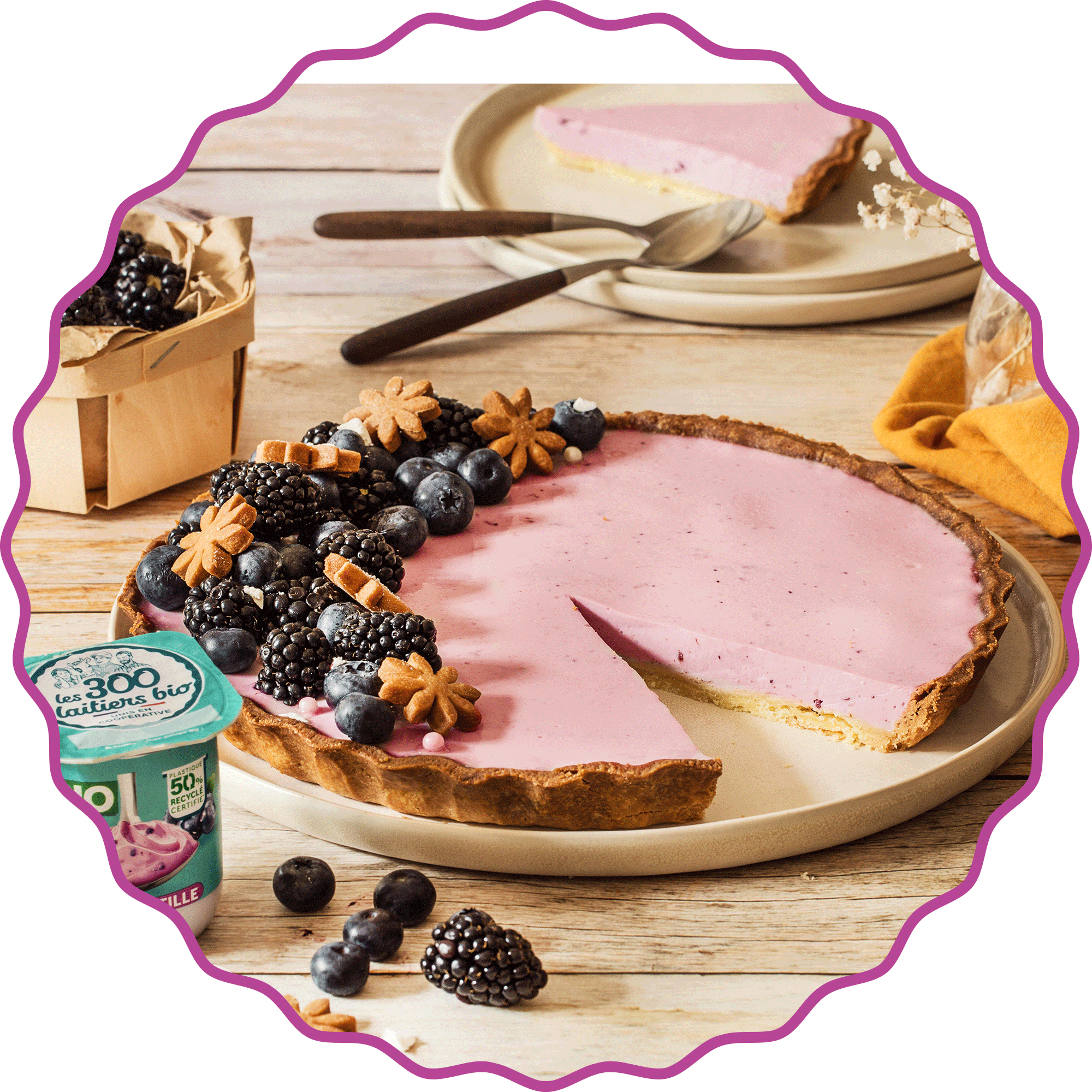 Décorez la tarte avec les mûres, les myrtilles, les petits sablés et la meringue coupée en morceaux.